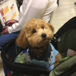 Duffy has completed his Puppy Good Citizen 1 training and we will start the Good Citizen 2 classes soon. I did get the ADA service dog certification. However, I was surprised that I wasn’t required to prove that Duffy could really meet all the requirements! No wonder there are reports of fraudulent use of the certification! But it does enable us to train Duffy more easily. The badge and paperwork enable us to take him into a friends restaurant when it is not too busy and he practices sitting quietly in his stroller while we eat. Inevitably, other guests want to snuggle him and ask questions about his training! It is very good for him to stay calm and loving, it’s hard for him to resist jumping with excitement! He just can’t get enough loving!