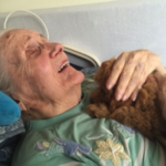 In mid-September my Mom was put on hospice. She had been blind and hard of hearing for the last few years and asked the doctors to take away all her Meds except comfort Meds a year ago. Even though we d been ready for a year this last part of her journey was so hard for her and devastating for me. Duffy was with us the whole time. Mom has always loved puppies and he was a comfort to both of us.