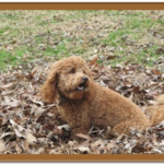 Maggie is an F1B mini that has earned her Canine Good Citizen Award.  At a year and a half, she is a terrific pet and wonderful family friend…well, she’s actually everyone’s friend!  She is quick to learn and enjoys the process of learning new commands and tricks. Her favorite indoor game is “Find It”. She brings me her “chewie,” I put her in a stay and hide it. Then she is released to find it. Which she always does even if it takes some time. That game morphed one day into her hiding the chewie and staring at me until I got the idea to go look for it! I never knew there would be game reciprocation!  Maggie runs like the wind and loves our once or twice a day frisbee and ball games. She is a good hiker and long walker as well.  I think if our two old cats were younger, they would have a great time with Maggie who wants to play, but they are above all that!  Now we look forward to taking the Therapy Dog International class next summer and, hopefully, volunteering this doggie joy and love at our local hospice.